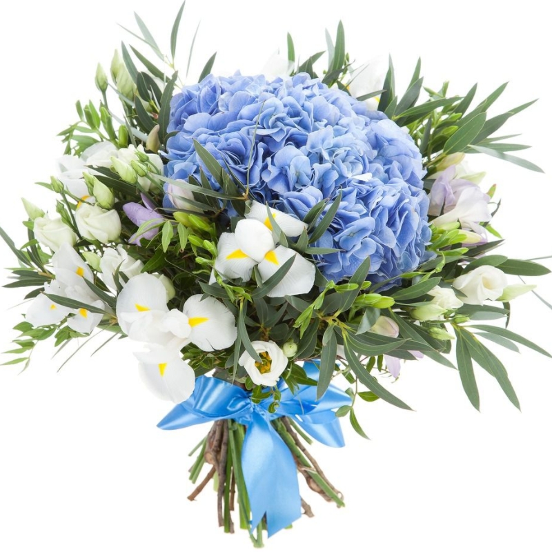 Букет состоит из 1 синяя гортензия, 11 белых ирисов, 9 веток эустомы, зелень, прозрачная упаковка, атласная лента.