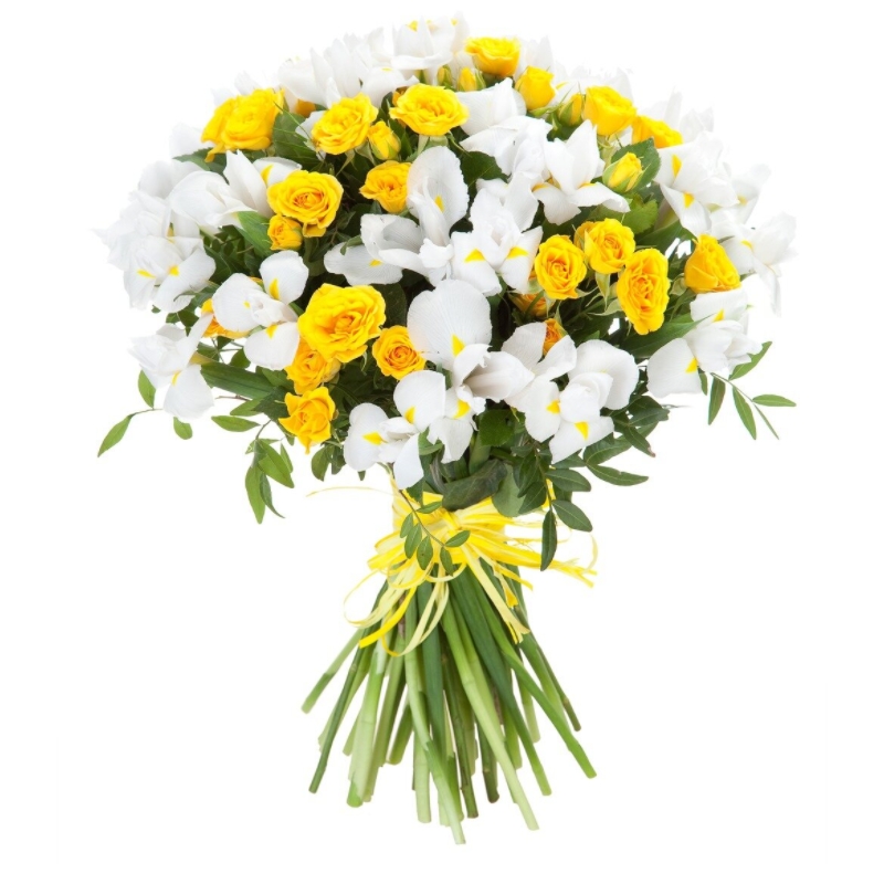 Букет состоит из 35 белых ирисов, 10 желтых кустовых роз, прозрачная упаковка, атласная лента.
