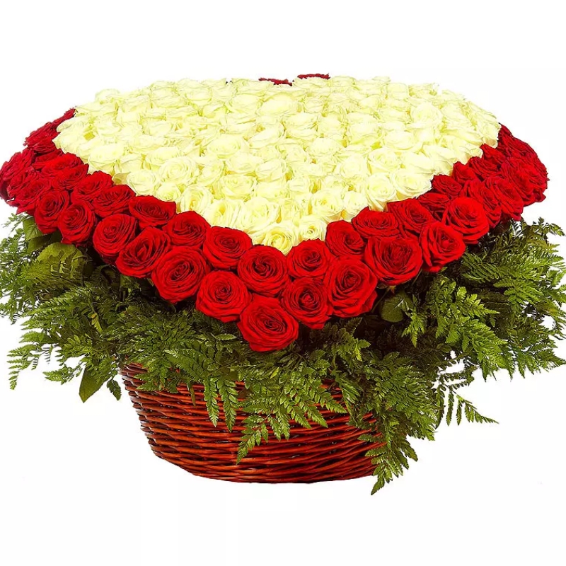 201 белая роза, 100 красных роз, зелень, корзина.