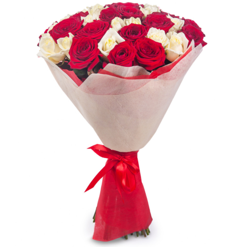 Букет состоит из 23 красные розы, 22 белые розы, красивая упаковка, атласная лента.