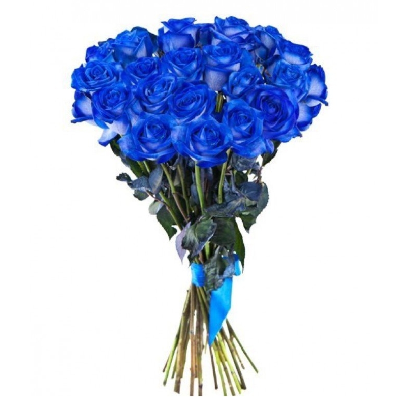 Букет состоит из 27 синих роз, прозрачная упаковка, атласная лента.